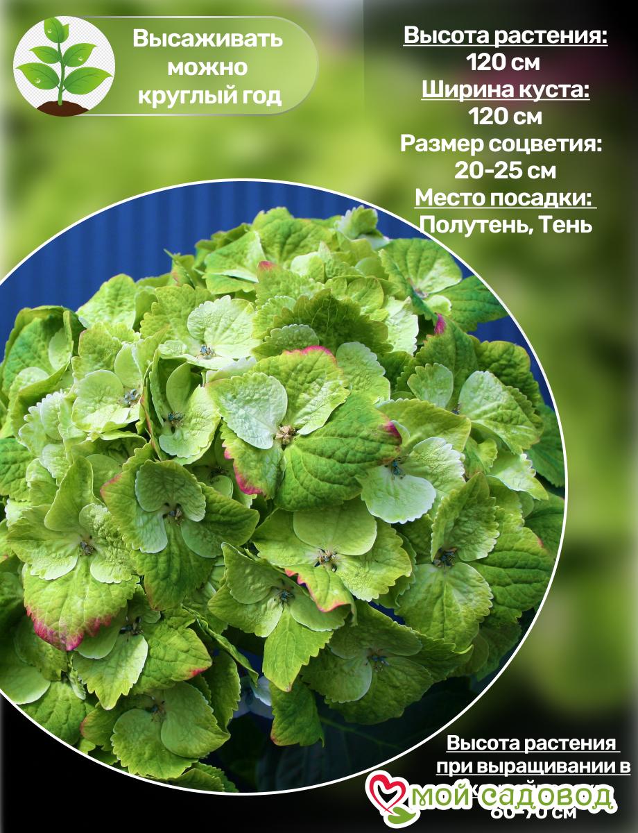 Гортензия крупнолистная ‘Magical Green Cloud’ – сорт входит в королевскую серию, выведенную из-за их компактного роста и способности повторять цветение в течение всего лета. У Green Cloud большие зеленые соцветия с белой зоной вокруг глазка, возвышающиеся над зелеными листьями с зубчатыми краями. Высота и ширина кустарника около 1,2 м. Цветки с возрастом становятся огненно-красными и сохраняю свой цветущий вид до сильных морозов. Гортензия имеет жесткие стебли, потому идеально подходит под срезку. УХОД Гортензии влаголюбивы. При отсутствии дождей раз в неделю их необходимо поливать из расчета 15-20 л на куст, при наличии дождей достаточно одного полива в месяц. Чтобы повысить прочность побегов, рекомендуется полив растений слабым раствором марганцовки. Два-три раза за сезон одновременно с прополками проводят рыхление приствольных кругов. В период бутонизации удаляют все слабые веточки с соцветиями. В первые два года после посадки рекомендуется мульчирование почвы сухой листвой и окучивание куста. Место для посадки Для посадки гортензии при выращивании в южных регионах предпочтительнее выбирать полутенистое место, в средней полосе и на севере России — хорошо освещенные или слегка притененные участки. Молодые растения рекомендуется защищать от полуденного солнца и ветра. Гортензии очень влаголюбивы, поэтому посадка вблизи деревьев, поглощающих много влаги, для них не подходит.   В нашем интернет-магазине вы сможете купить Гортензия Так же возможно вас заинтересуют Гортензия крупнолистная «Гертруд Гленн» и Гортензия крупнолистовая «Гамбург».