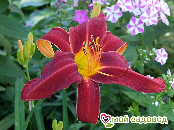 В высоту цветоносы достигают 80 см. Они красиво возвышаются над ярко-зеленой листвой и не остаются незамеченными. На макушках цветоносов образуются крупные цветки диаметром 12 см. Лепестки аккуратно отгибаются в разные стороны. Окрашены они в глубокий бордовый цвет. Причем у основания они с желтым оттенком. Также пикантный вид лепесткам придают желтые продольные полоски. Аромат тонкий и ненавязчивый.