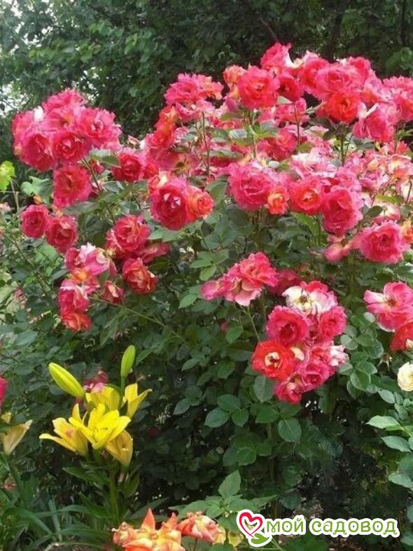 Уход за розой Арлекин не сложен, купив рассаду в питомнике ее сможет вырастить и начинающий дачник. Особенность сорта – появления множества новых побегов и их быстрый рост. Куст разрастается до 1 м в ширину, он густой состоит из большого количества толстых разветвленных побегов. Важно перед посадкой рассады подготовить надежную опору.